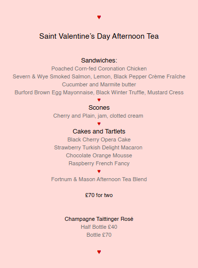 Treat your loved one to a wonderfully romantic and delicious Valentine’s Afternoon Tea ! Available for you to enjoy by the log fire in The Lounge or at a table in The Garden Room if you prefer from Wednesday 11 to Sunday 15 February - perhaps with the added treat of a flute of Taittinger Rosé!